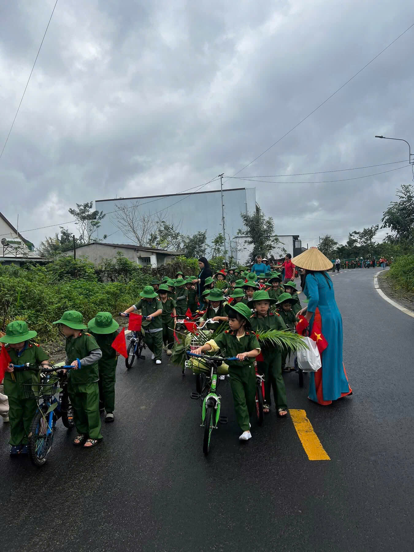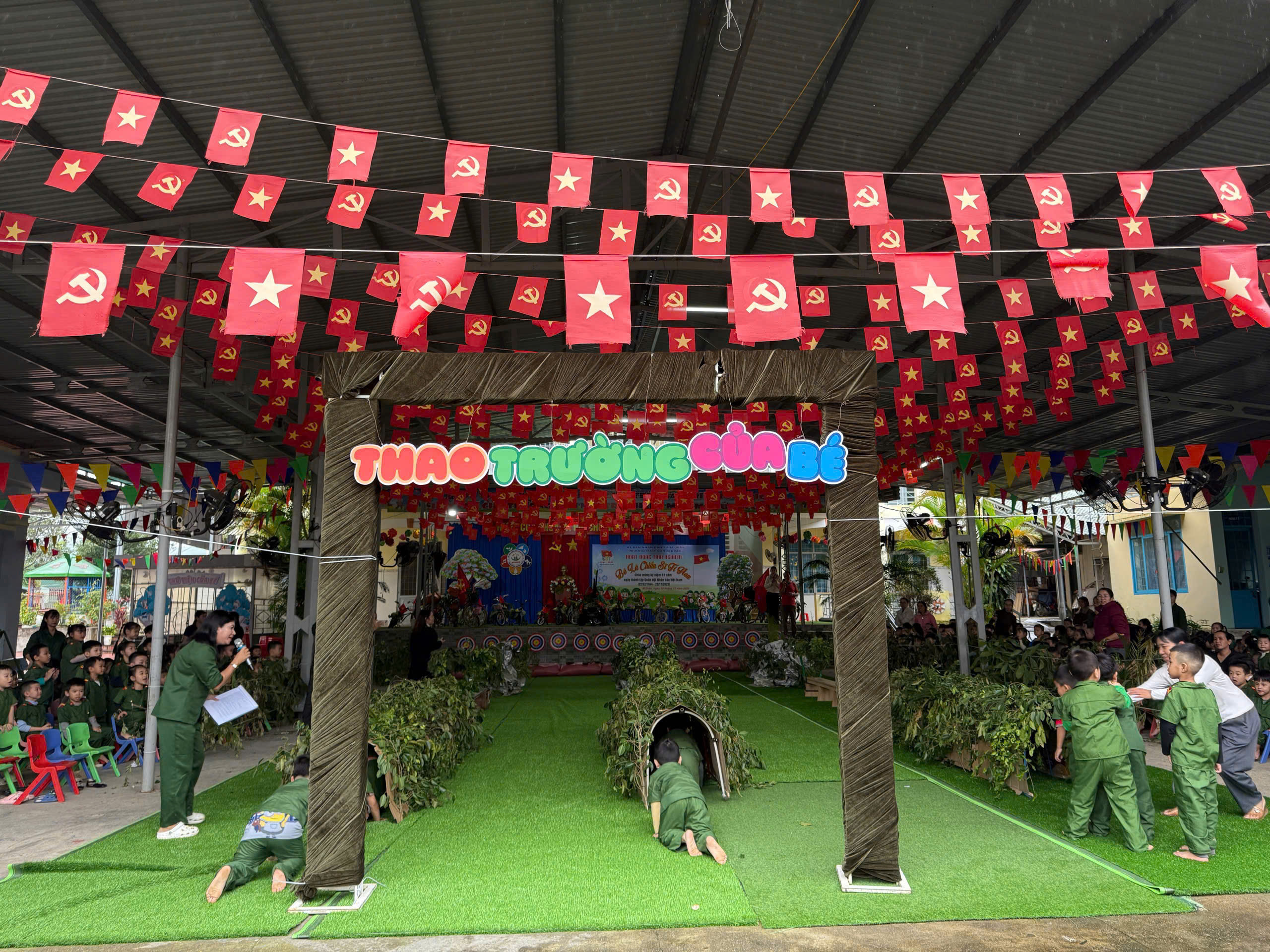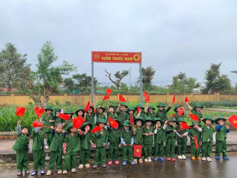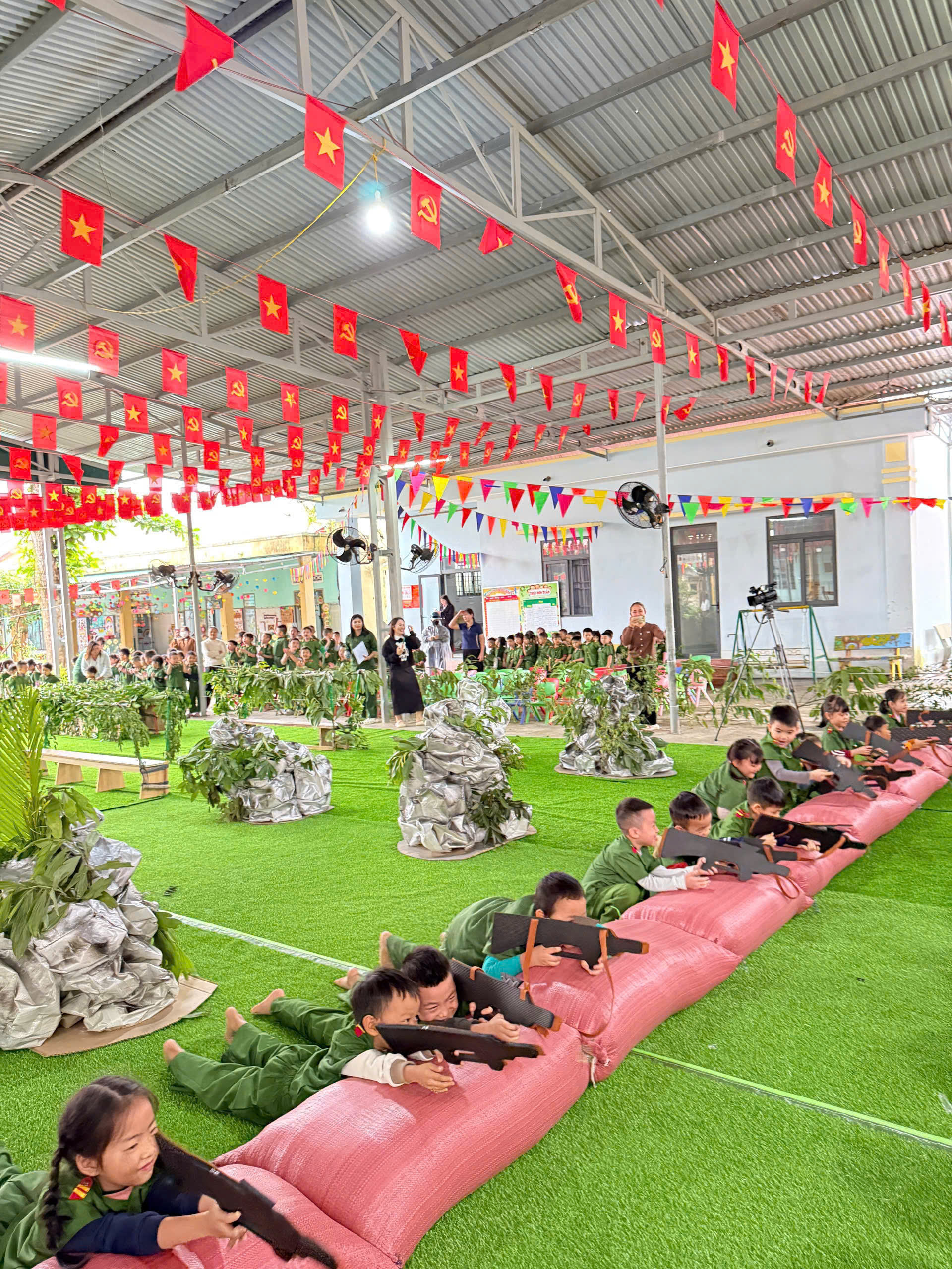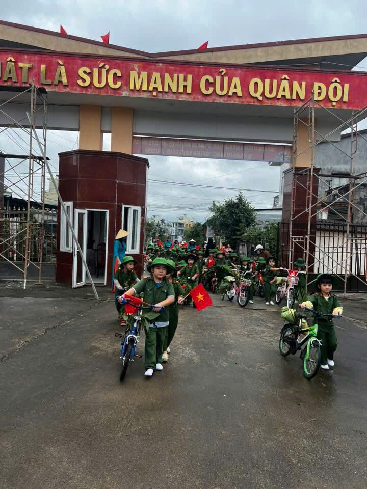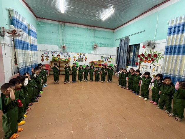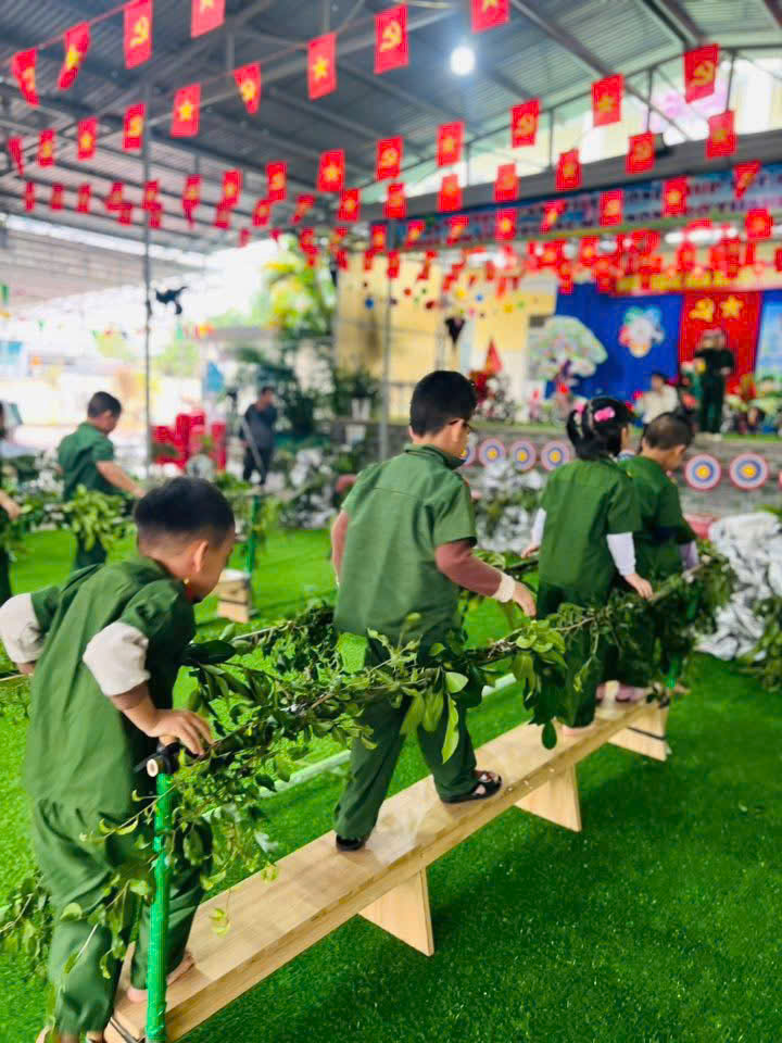 Đặc biệt, hoạt động thử thách làm “Chú bộ đội tí hon” mang đến cho trẻ những bài học sống động mà sách vở khó có thể truyền tải. Khi khoác lên mình bộ quân phục nhỏ xinh, tập xếp hàng, chào cờ, hành quân hay tham gia các trò chơi rèn luyện, trẻ học được tính kỷ luật, sự gọn gàng và tinh thần trách nhiệm. Mỗi động tác tuy còn vụng về nhưng ánh mắt các em ánh lên niềm tự hào và háo hức, như thể các em đang thật sự trở thành một người lính nhỏ tuổi.