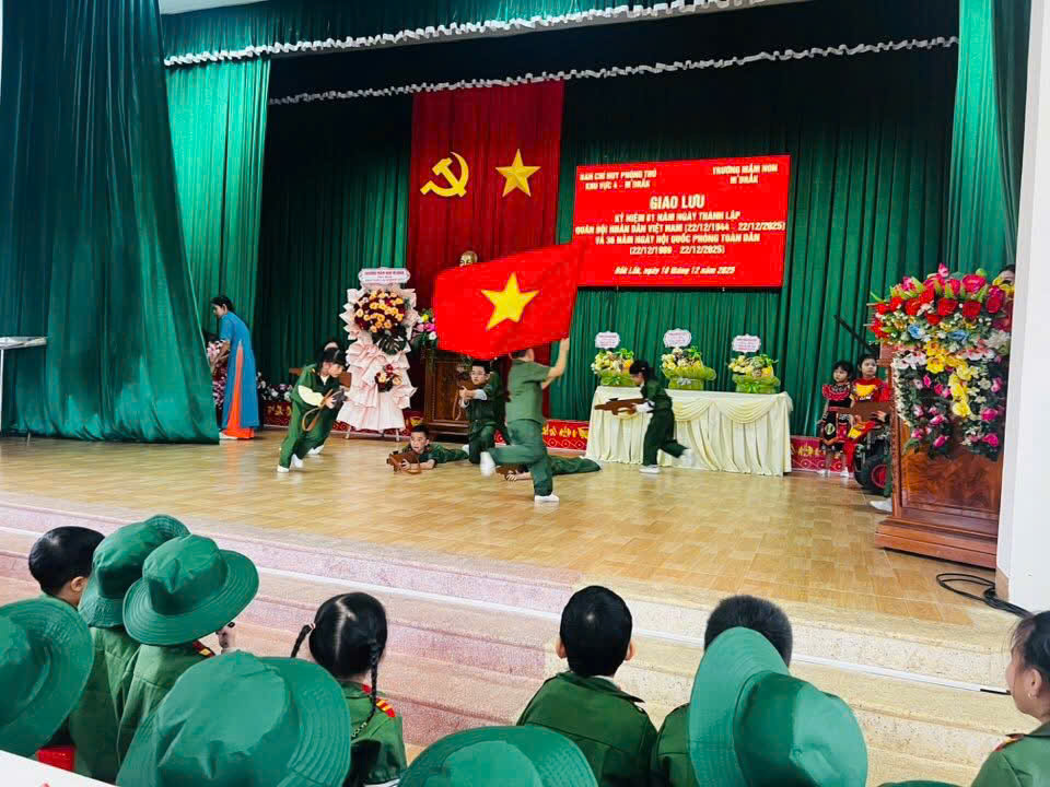Hưởng ứng ngày 22/12 – Ngày thành lập Quân đội Nhân dân Việt Nam, trường Mầm non M’Drắk đã khéo léo lồng ghép nội dung giáo dục về hình ảnh người lính vào các hoạt động học tập trên lớp phù hợp với lứa tuổi trẻ. Thông qua các tiết trẻ được làm quen với hình ảnh “Bộ đội Cụ Hồ” một cách gần gũi, nhẹ nhàng. Đặc biệt, trong giờ học, trẻ được mặc trang phục bộ đội, vào vai những “Chú bộ đội tí hon”, tập xếp hàng, chào cờ, hành quân và thực hiện các vận động đơn giản. Qua đó, trẻ không chỉ tiếp nhận kiến thức mà còn hình thành những cảm xúc tích cực như sự yêu quý, kính trọng và niềm tự hào đối với các chú bộ đội.